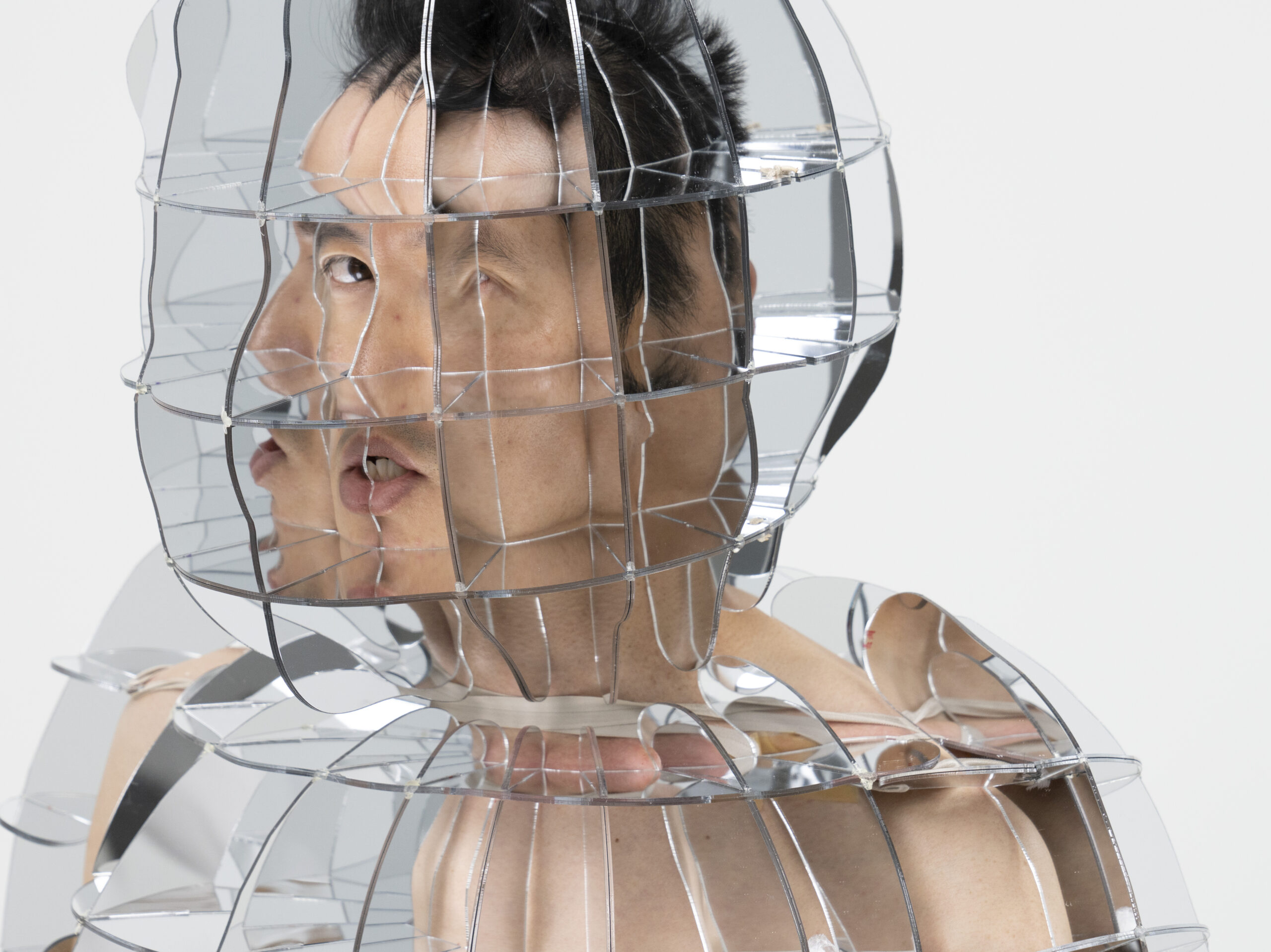 “Mirror Armor” (2021), another piece created during the pandemic, is an intricate, full-body suit made of mirrors that takes about two hours to put on, though he can only bear to wear it for an hour. “It’s very uncomfortable and quite heavy,” he says. Watching a video of him lumbering around in it, you can see the absurdity of our infatuation with our appearances, the silliness of vanity taken to the extreme.