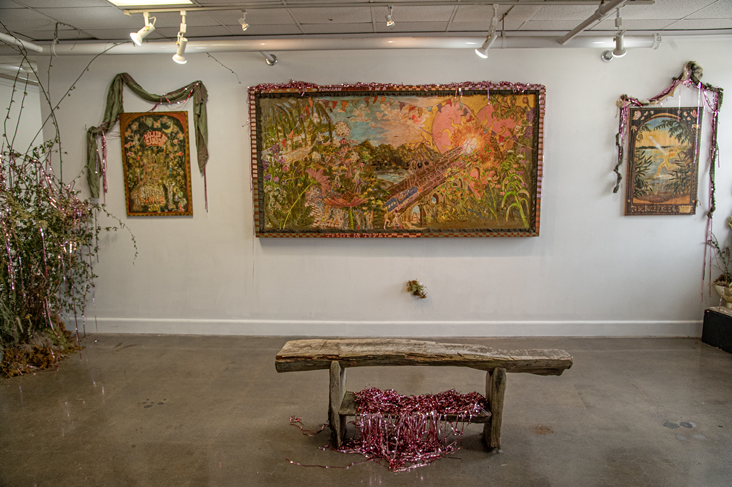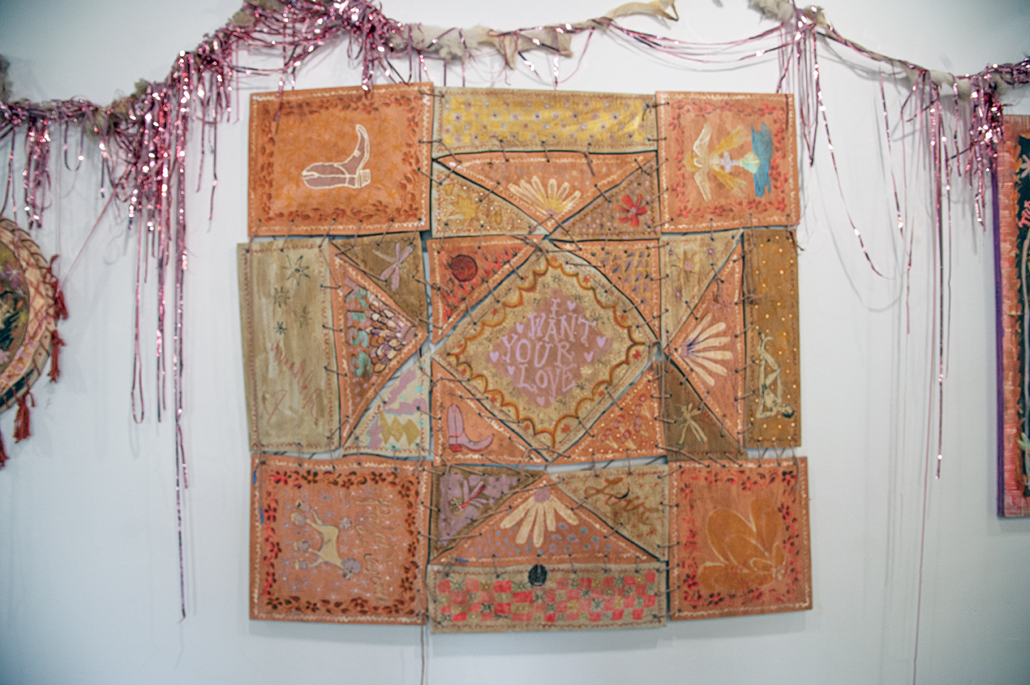 Most of the paintings are on found wood panels, some tied together with yarn making a kind of D.I.Y. book, which gives them a spontaneous and earthy feel—as if Harris is so overcome with joy and celebration that he must paint immediately, on whatever material is lying around. In “Erotic City,” a cowboy’s eyeballs bulge the way a Loony Toons coyote’s might when a sexy coyote slinks by. AWOOGA, the painting reads; the sound we assume the cowboy makes the instant desire sets his loins and heart ablaze. The depiction is hyperbolic in one sense, but on the other hand, damn if it doesn’t feel like that in real life. There’s a definite 1970s underground comix feel, think R. Crumb and Barbara “Willy” Mendes’s bendy-limbed folks gallivanting through spiraling, trippy chaos. There’s also a loving, hobo earnestness like an ultra-erotic, pansexual Margaret Kilgallen. Shiny, pink mylar streamers and lengths of branches and leaves decorate the walls and gallery space. The whole experience feels like you followed a distant thump of bass to a secret clearing by the river where the best party of the year just got into full swing.