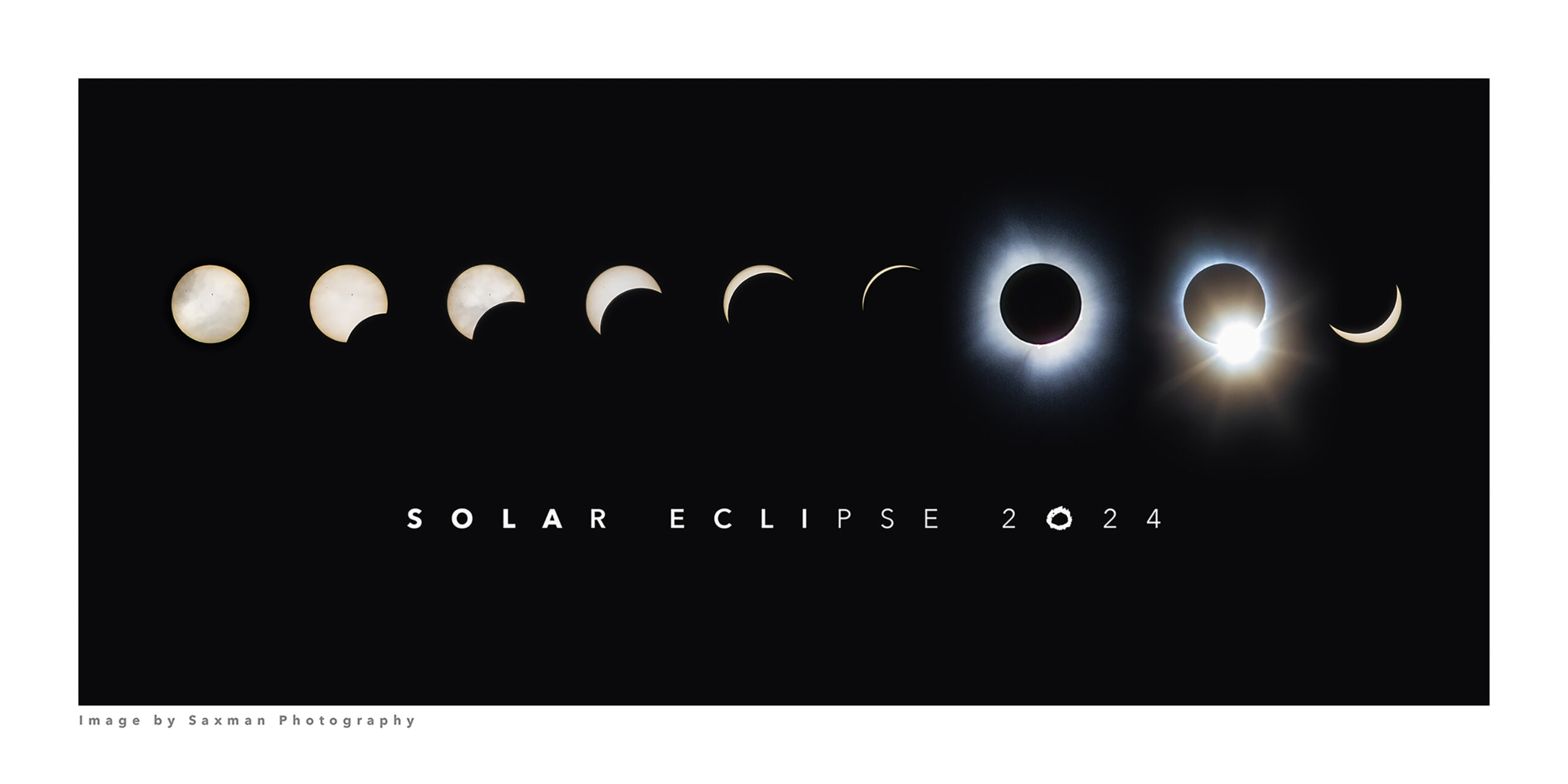 [Visit] www.saxmanphoto.com, click “Archive” then “All Galleries.” Fine art prints are available for sale, an edition of 200. [It’s a] 10×20 archival print on watercolor paper of 2024 Solar Eclipse sequence, photographed from Ashtabula, Ohio, and signed by the photographer. Print dimensions include white border.