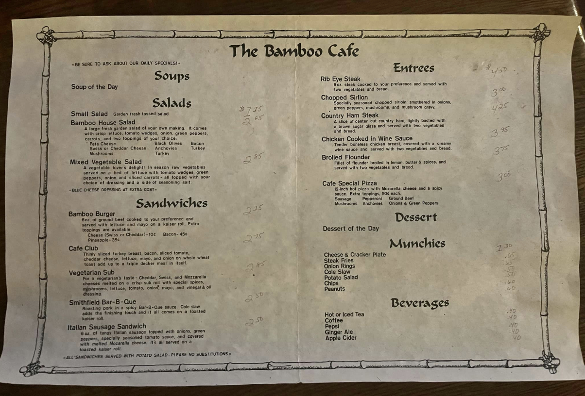 The place has been around long enough to have a healthy amount of intrigue surrounding it. For instance, even those who have visited Bamboo many times may be surprised to learn about the secret pie menu. Buttermilk, chocolate chess and Key lime are typical offerings.