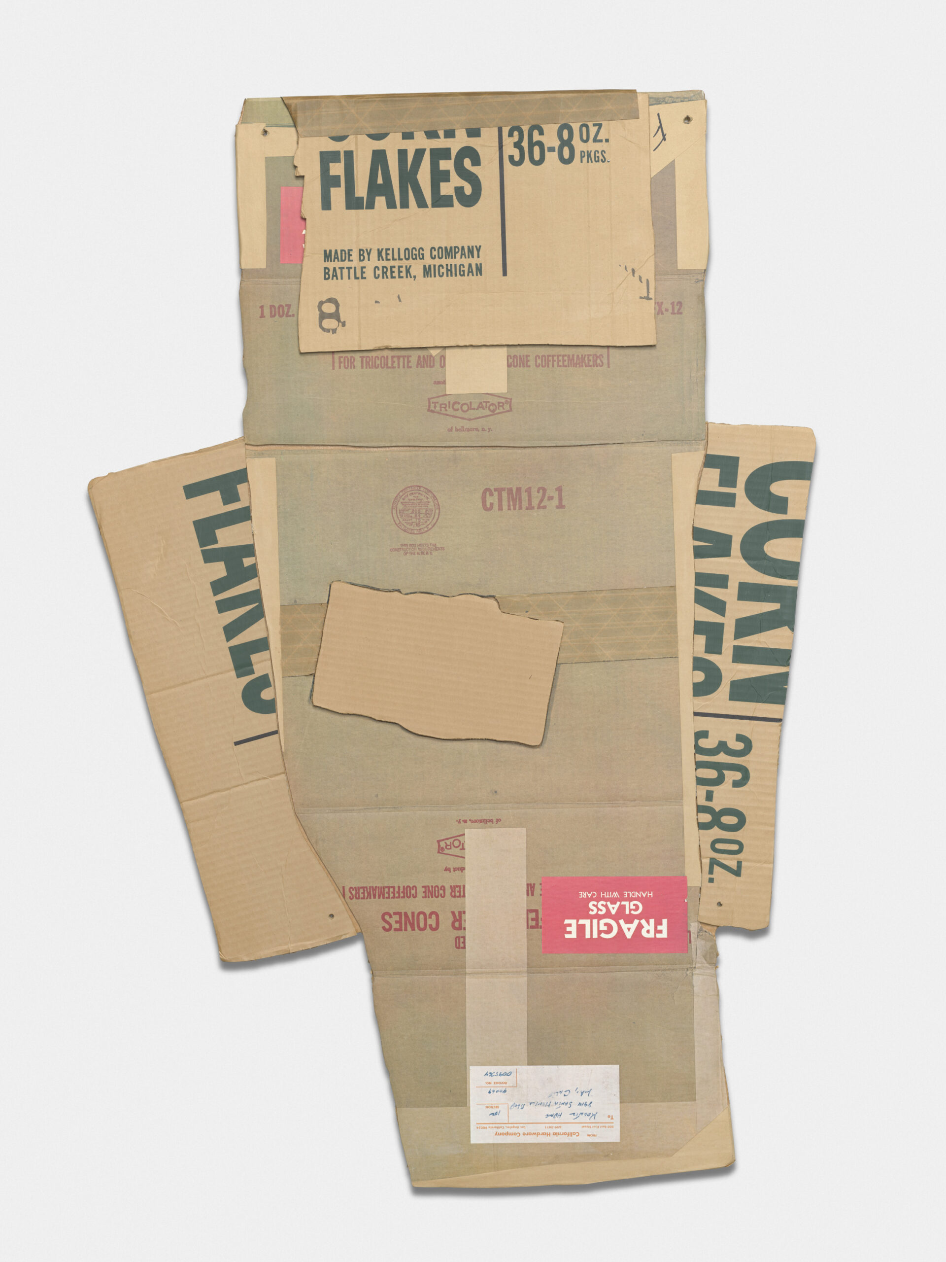 The “Cardbirds” series recreates flattened cardboard boxes that Rauschenberg found in dumpsters near La Cienega Boulevard in Los Angeles. In these works, the viewer can find birds, an anglerfish, even a door. Printed at artist workshop Gemini G.E.L., the series painstakingly recreates the labels, torn edges and folds of the original castoff boxes. The trompe l’oeil effect is so convincing that “Cardbirds” are often mistaken for actual cardboard boxes.
