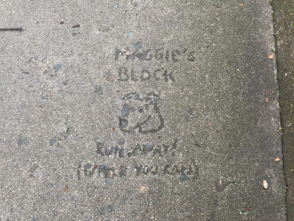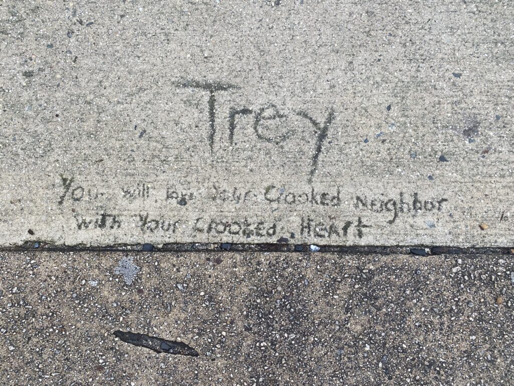 The Gun Hole isn’t the only sidewalk art in the Fan and Museum District. On the 500 block of North Sheppard Street is a drawing of a dog that reads “MAGGIE’S BLOCK: RUN AWAY! (WHILE YOU CAN).” Another impression, on the 2700 block of Hanover Avenue, reads “Trey: You will love Your Crooked Neighbor with Your Crooked Heart.”