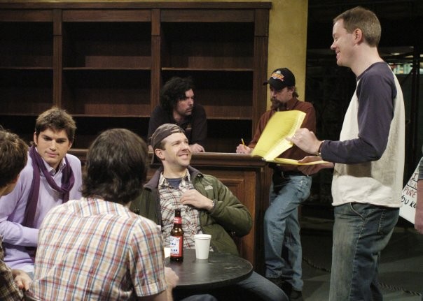 Suddenly, they’re back from commercial. Thick cables run along the floor leading to a mobile camera and an overhanging boom microphone. Host Ashton Kutcher, who definitely looks like a former underwear model up close, stands a few feet away, on camera.
