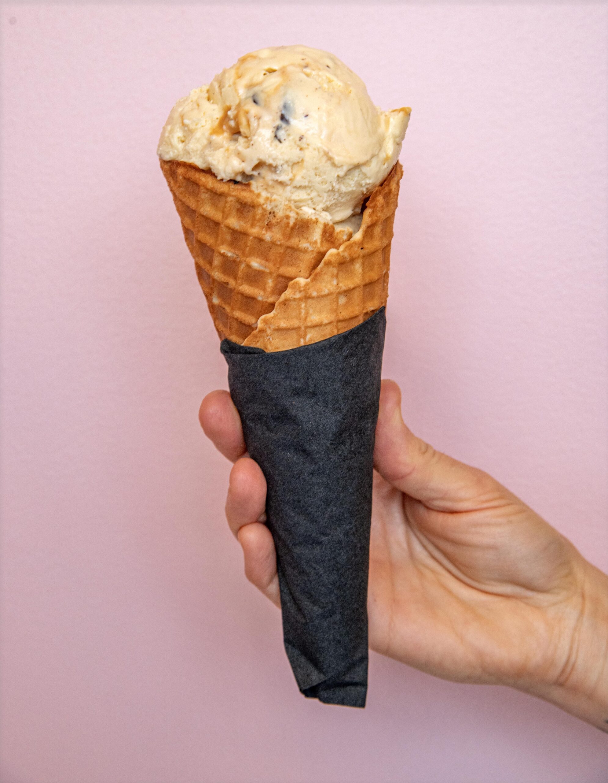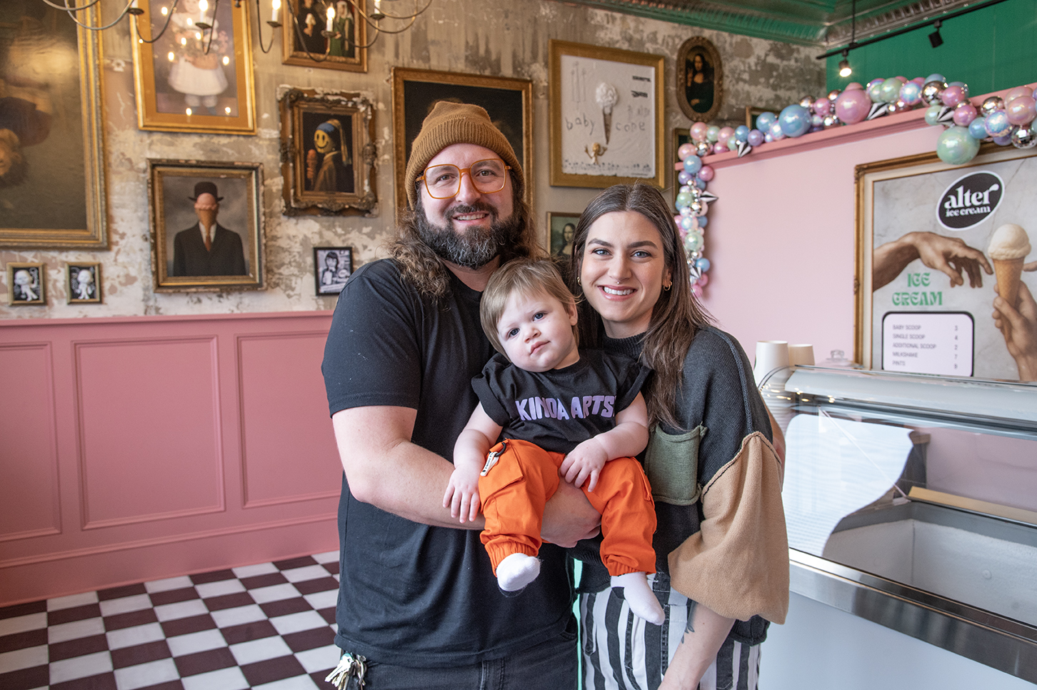 Outside of their businesses, Corey and Lori are both visual artists. The couple’s artistic skill is evident not only in their creative ice cream menu, but also in the carefully curated vibe of the shop. The pair undertook the space’s renovation themselves, painting the walls bubblegum pink and installing a black-and-white checkered floor that evokes a classic, mid-century ice cream parlor.