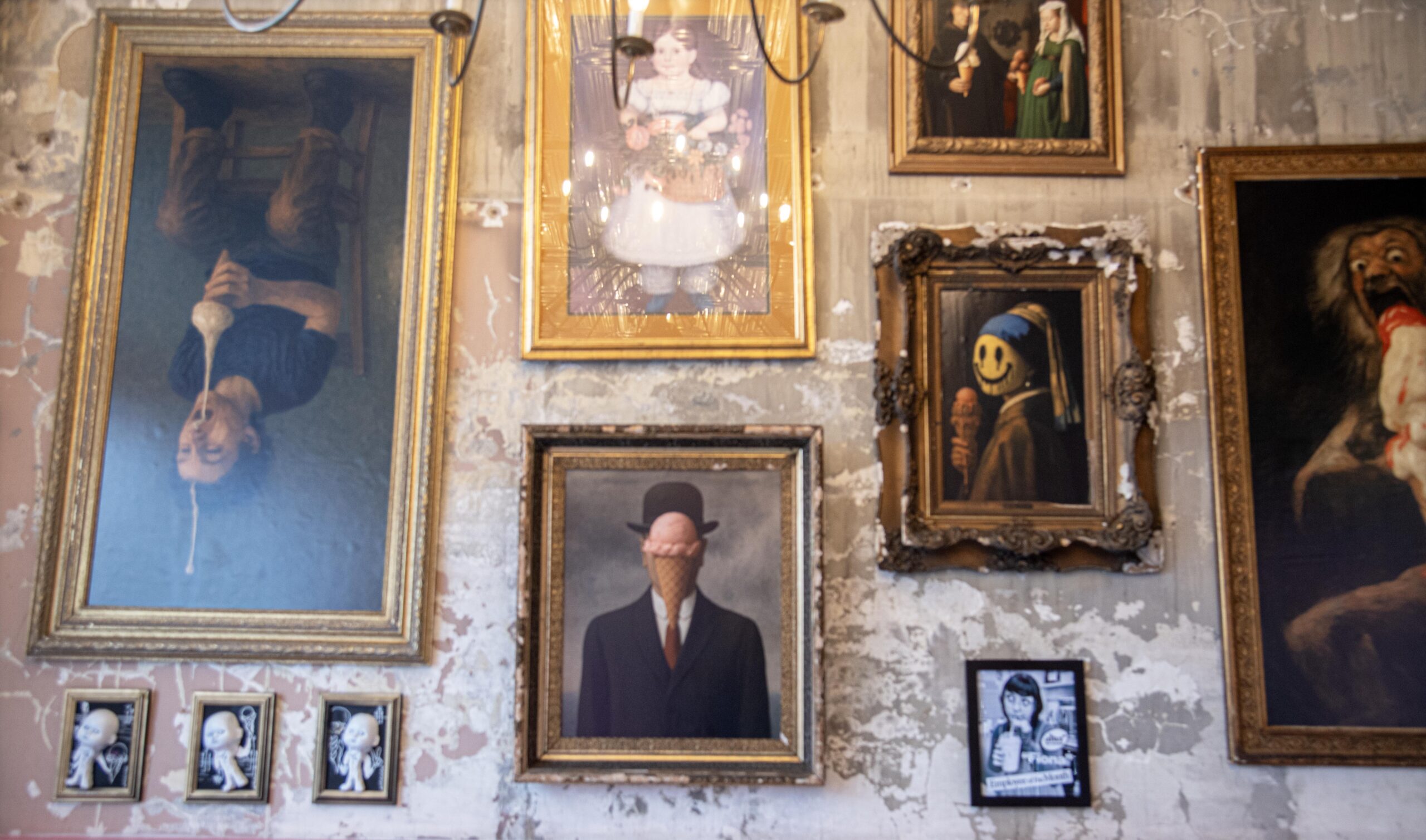 For a fun and creative flourish, the interior wall features cheeky re-imaginings of famous art pieces. One painting resembles Magritte’s “Son of Man” but includes an ice cream cone where the green apple should be. Right next to it sits Vermeer’s “Girl with a Pearl Earring,” who holds a frozen treat and hides behind a cartoon smiley face.
