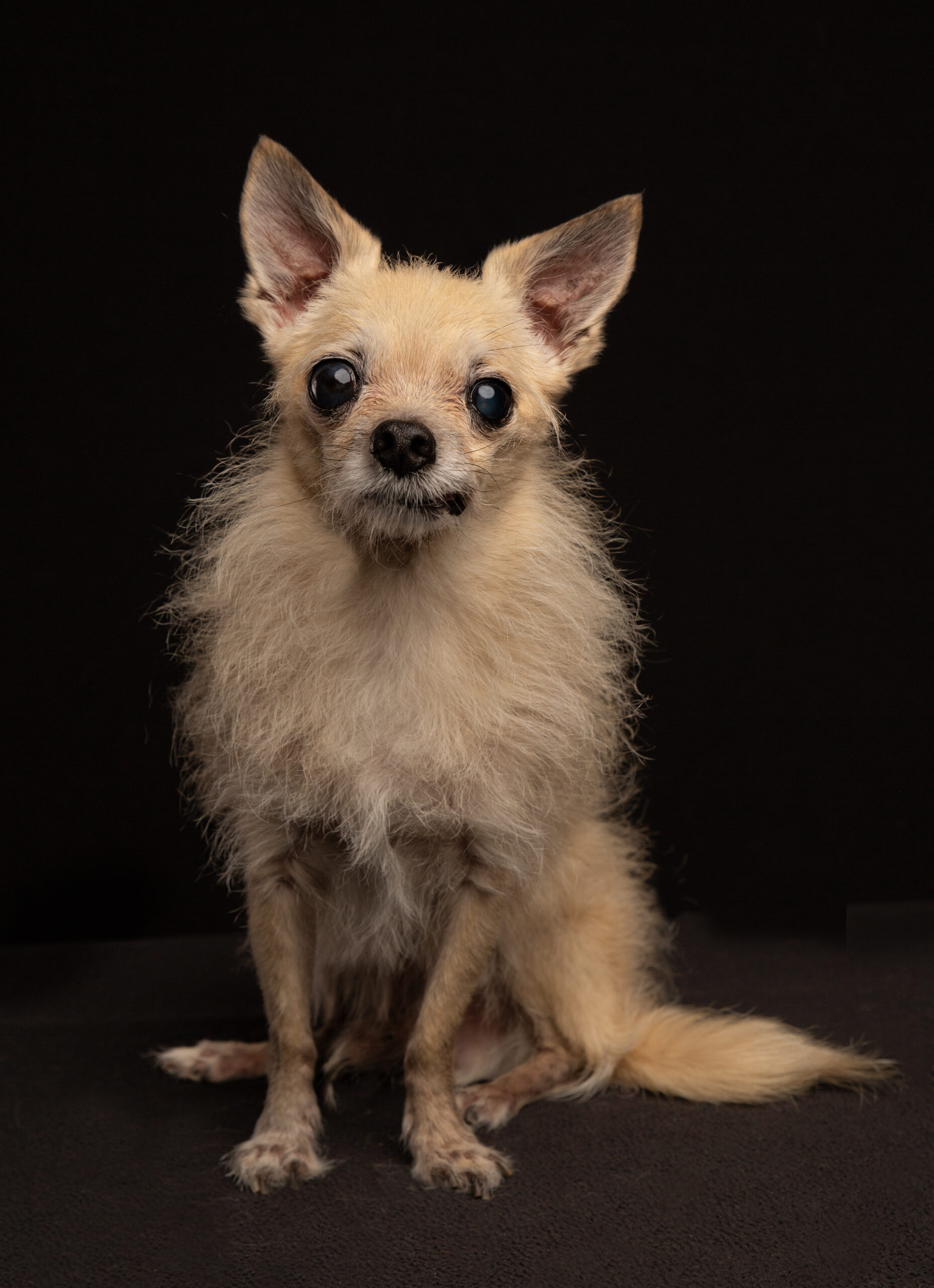 Bunky was saved from a hoarding situation where he wasn’t being cared for properly, Kelley says, and received little to no human interaction. When she visited FLOP to adopt, most of the dogs were loud, jumping, trying to get her attention. But Bunky was quiet in the corner, hiding behind a few poodles.