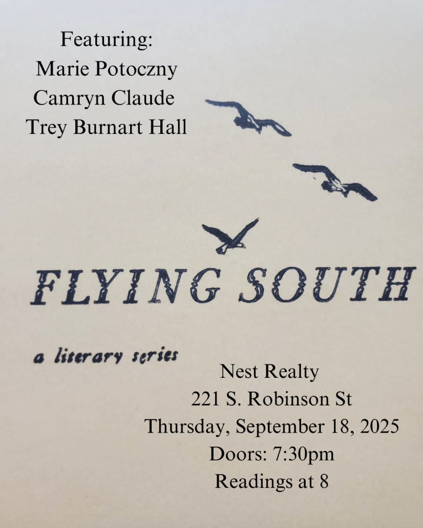 The next installment of “Flying South: a literary series” will be held Thursday, Sept. 18 with readings by VCU MFA candidates Marie Potoczny, Camryn Claude and Trey Burnart Hall at Nest Realty, located at 221 S. Robinson St. Doors are at 7:30 with readings starting at 8 p.m. There will be complimentary refreshments with an opportunity to tip participants and donate to Richmond Reproductive Freedom Project and He She Ze and We.