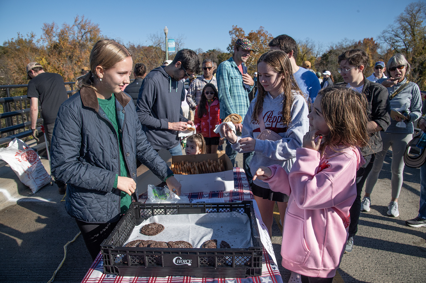 With vehicle traffic blocked from crossing the bridge, hundreds gather for a festival-like party with a coffee cart, a pancake truck and musical performances by Pay Rent Brass Band and bluegrass players The Hot Seats.