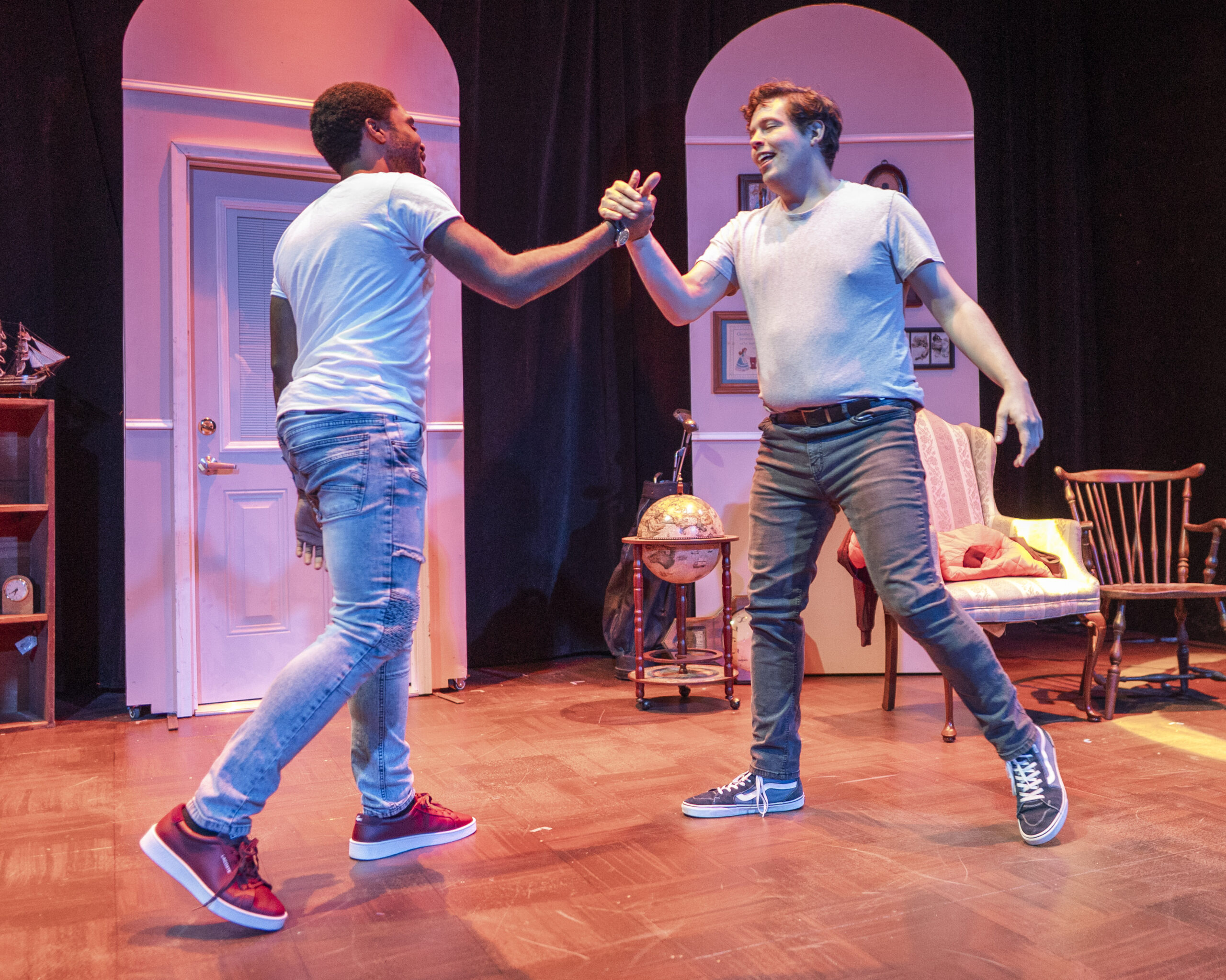 St. Peter’s hand in making this engine hum is evident throughout. In a couple short vignettes, the lights dim, collapsing focus on a character during an especially personal moment (lighting design by Tristan Ketcham). The show’s pace never flags and the sound design (by St. Peter) instills a period-specific mood using songs of the time.
