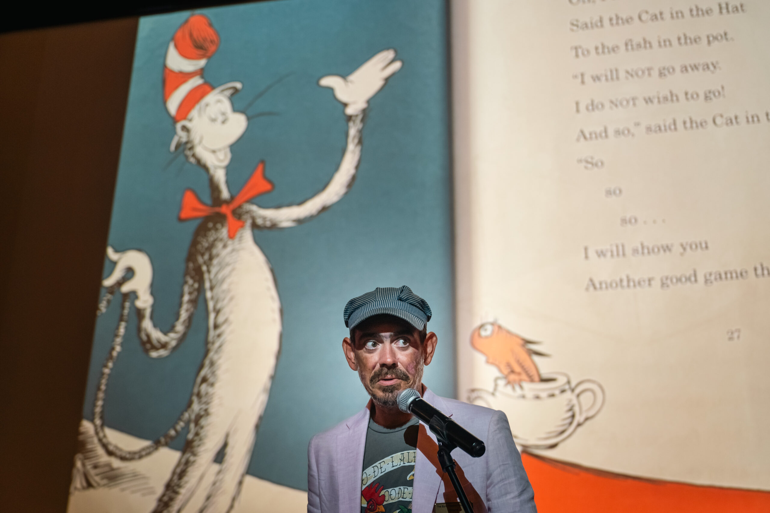 Operations Manager Shane Brown mans a music stand and microphone in a powdered-pink suit, sporting a T-shirt and train conductor’s cap, indicating that, sure, there will be stops along the way, but he’ll get everyone to where they’re going on time. The auditorium is comparatively quiet and still as he welcomes everyone and introduces the first story, a classic: “The Cat in the Hat” by Dr. Seuss.