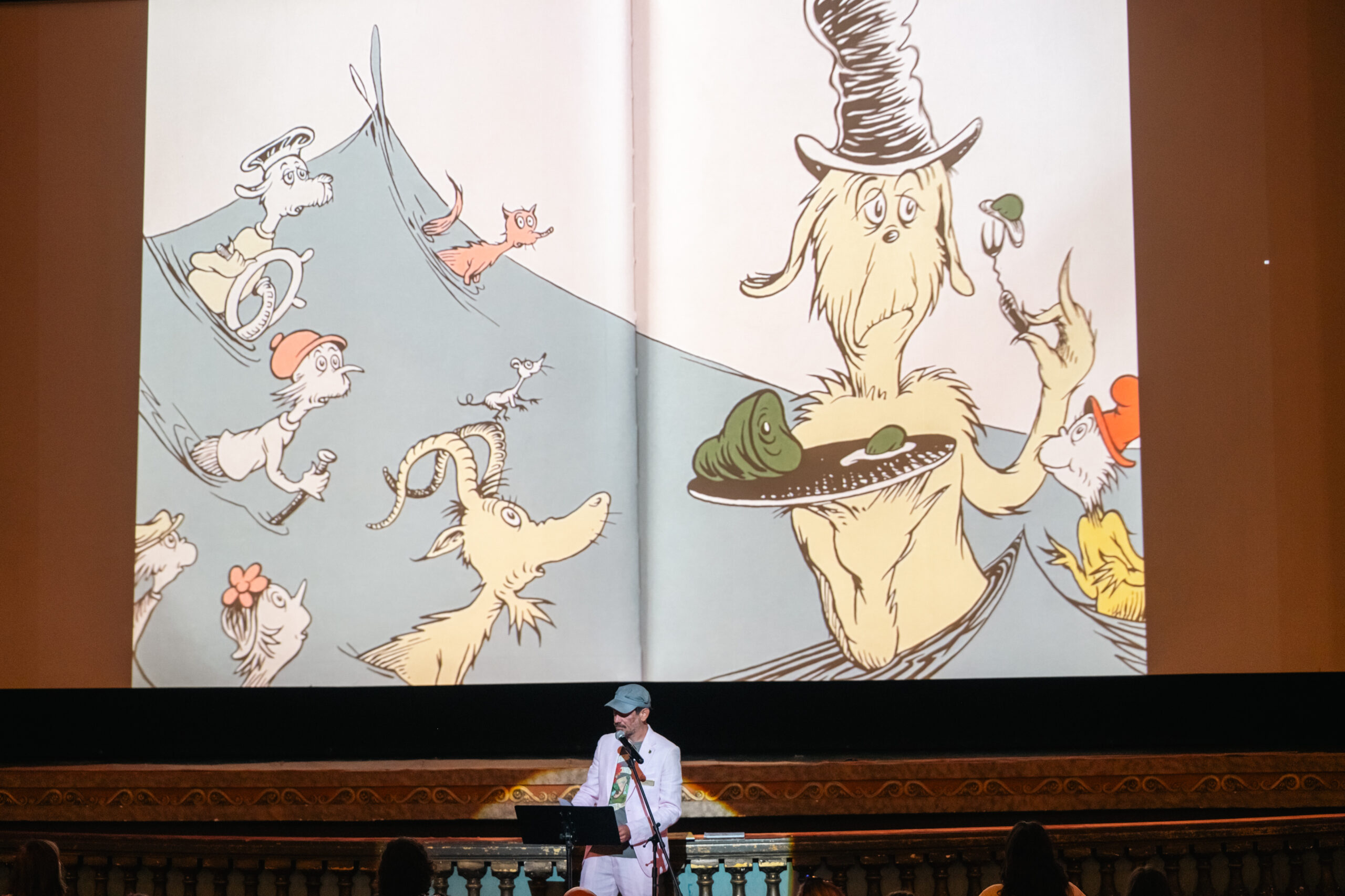 Brown wastes no time segueing into the next story, a more recent title, “Little Blue Truck Makes A Friend” by Alice Schertle and Jill McElmurry. A consummate storytelling professional, he appears unphased when a member of the audience makes a break for it, running up and down the aisle before pacing the length of the stage on their knees, noiselessly. Next up is the modern mainstay, “Pete the Cat: I Love My White Shoes” by James Dean and Eric Litwin; followed by “Underwear” by Mary Elise Monsell, and finally, to bookend this installment of Story Time, “Green Eggs and Ham,” again by the good Dr. Seuss. New guests arrive casually throughout the proceedings just as others funnel out during brief windows in between readings.