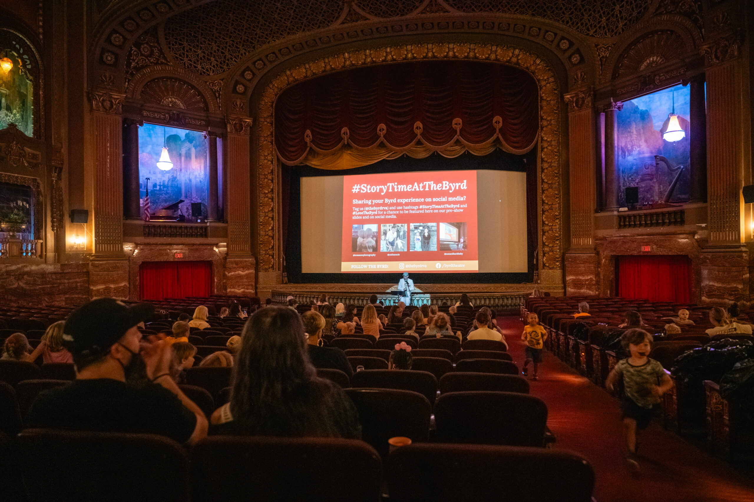 Moments before showtime, a group enters the room holding hands, in a single-file line. They settle in, notably calmer than the rest of the audience gathered so far, and spread dutifully across an entire row of seats. Much of the audience squirms and points ahead at the screen, out toward the wings, and up at the ceiling with eyes on the balcony, as if each and every inch of the room is on display and a subject of brief fascination. They fidget in their seats and turn to face in every direction other than straight ahead. Some spill out into the aisle, flailing. One lets out a prolonged melodic howl that reverberates throughout the palace theater. It’s 10 a.m. on a Wednesday in August and a sizable crowd of 2-to-4-year-olds wait (not-so-patiently) in their seats for Story Time at the Byrd Theatre to begin.