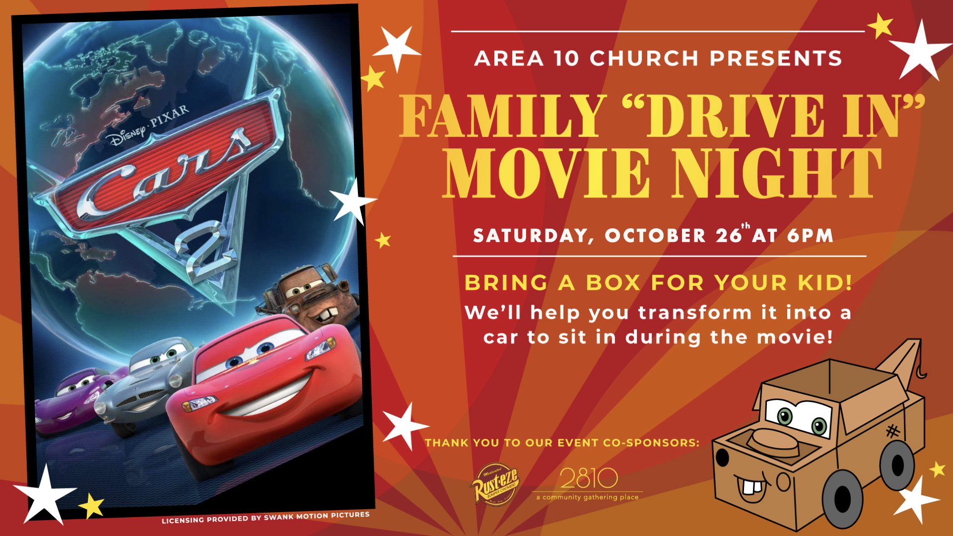 2810: a community gathering place 2810 W Cary Street, Richmond, VA, United StatesJoin us for a FREE family movie night in the city, drive-in style! On Saturday, October 26th, we will be showing the movie Cars 2 in our back courtyard in Carytown from 7:00pm-9:00pm. To make this even more fun for families, we'll have a "design your own box car" time from 6:00pm - 6:45pm. Just […]