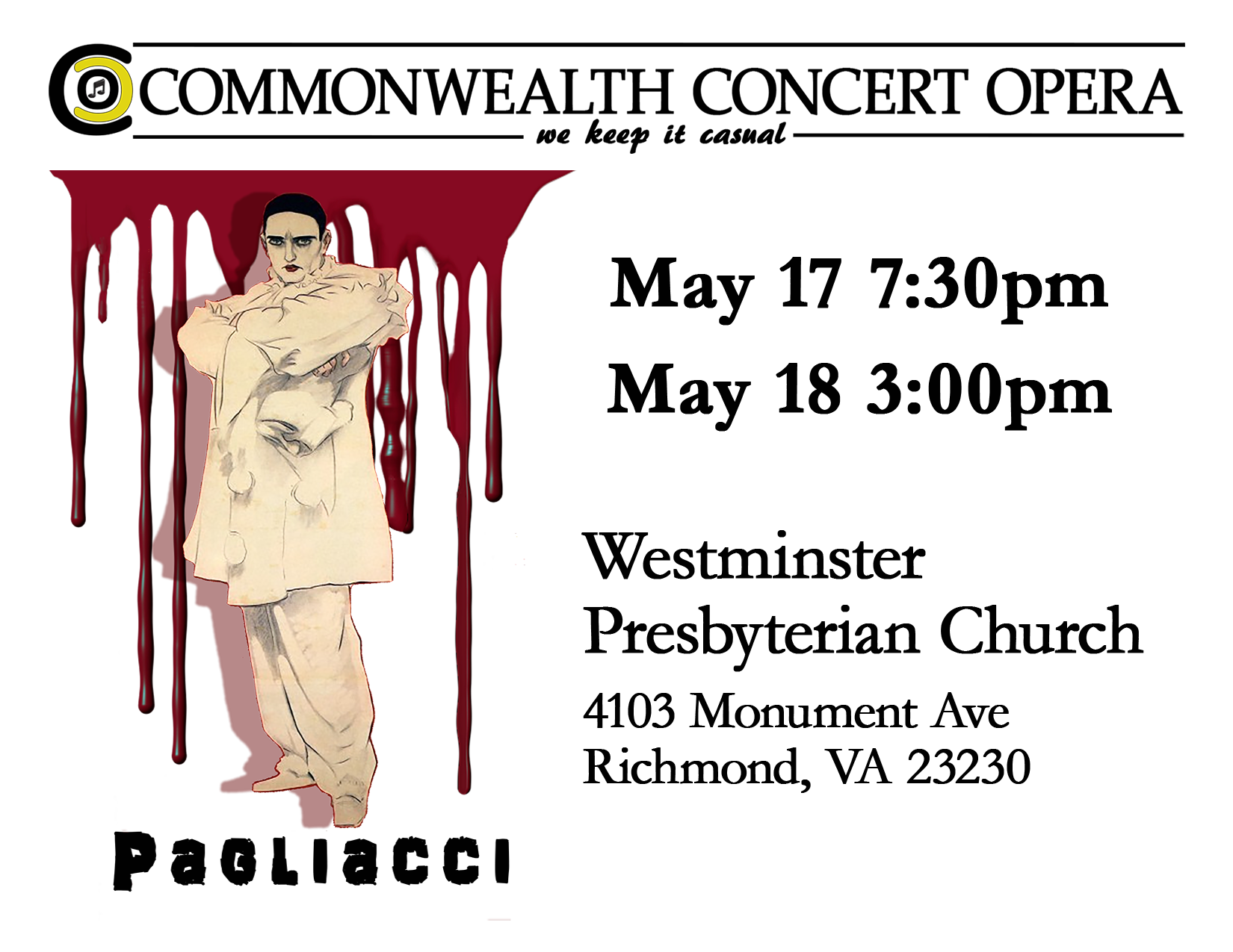 Art and reality blur into a final tragic conclusion in Leoncavallo's lush dramatic opera. Commonwealth Concert Opera present two performances: May 17 7:30pm and May 18 3pm