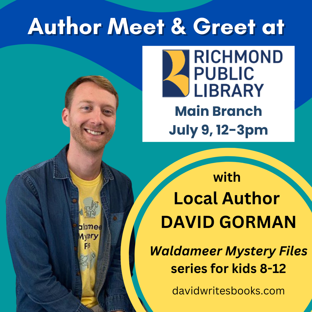 Richmond Public Library (Main Branch) 101 E Franklin St, Richmond, VA, United StatesMeet the author of the popular Waldameer Mystery Files series for kids 8-12! Local author David Gorman will be chatting with readers, signing books, and taking photos at this FREE event. Books will be available for sale, or spin the prize wheel for a chance to win a free book or swag! David will be […]
