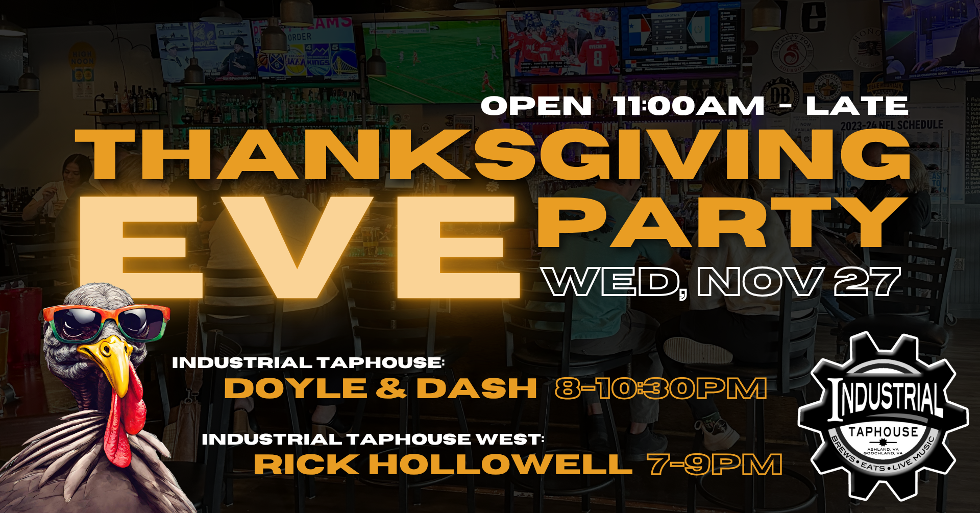 Industrial Taphouse 10392 Leadbetter Rd., Ashland, VA, United States +1 moreThe party before the feast is back??Thanksgiving Eve is right around the corner, and we’ve got an awesome night planned at BOTH IT locations! ⭐️ DOYLE & DASH @ Industrial Taphouse (Ashland) | 8-10:30PM ⭐️ RICK HOLLOWELL @ IT West (Goochland) | 7-9PM Bring your family & friends, and kick off Turkey Day right!?