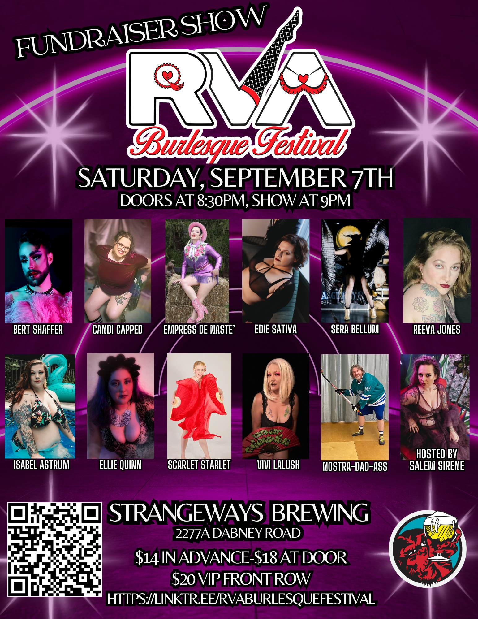 Strangeways Brewing 2277A Dabney Road, Richmond, VA, United StatesWe're amping up for the return of the RVA Burlesque Festival in 2025! With an event of this size and caliber, we need your help to get there! We've got a spectacular lineup of performers for an amazing night of burlesque and variety entertainment at Strangeways Brewing to raise funds for the weekend long celebration […]
