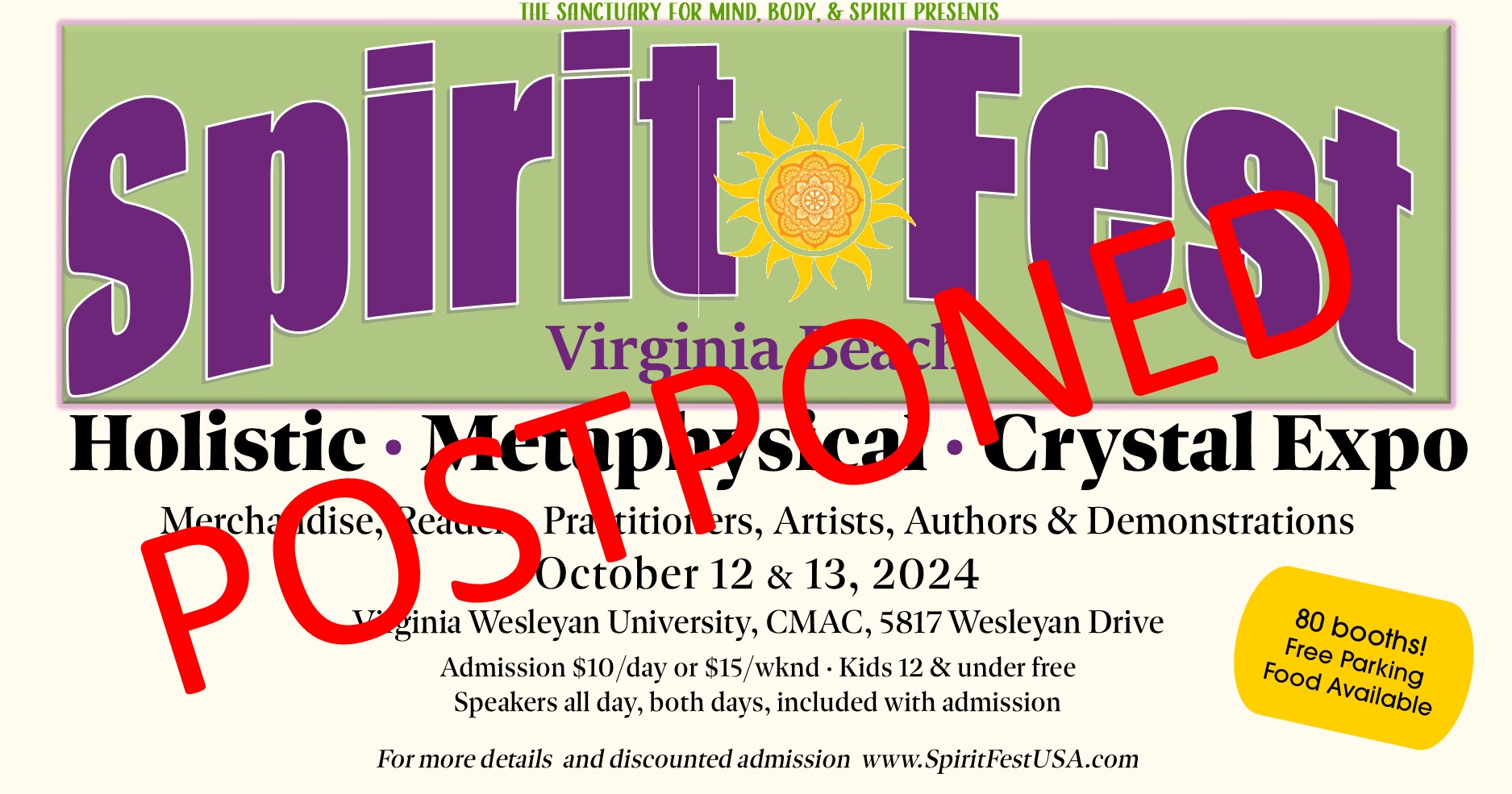 Virginia Wesleyan University 5817 Wesleyan Dr., Virginia Beach, VA, United StatesPOSTPONED* We are based in Florida and unfortunately cannot travel due to storms and closed highways. RESCHEDULED for March 2025. Find us at the Cunningham Multi-Cultural Center (CMAC) The acclaimed Spirit Fest Expo is now across the East Coast and proudly coming to Virginia Beach! The BEST readers, healing practitioners, and merchandise vendors from across […]