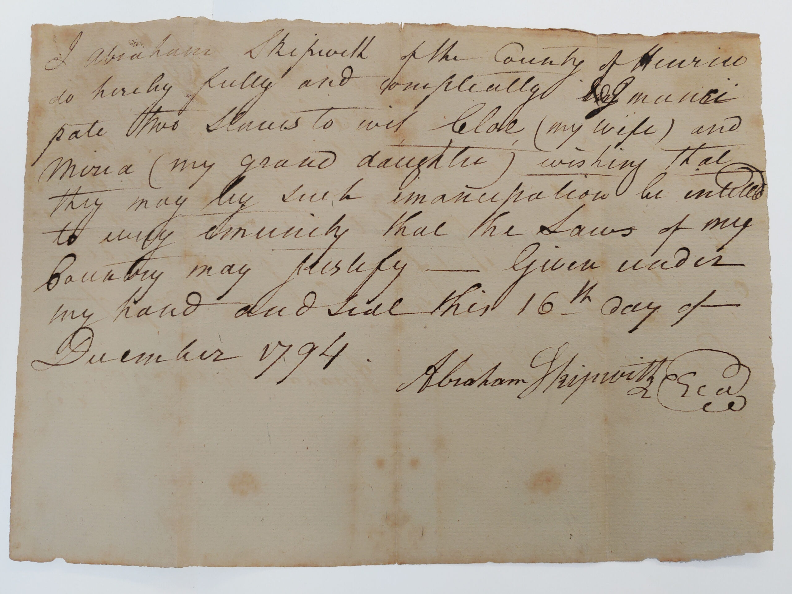 But who was Abraham Peyton Skipwith? According to the exhibit, he was a mixed-race Black man of mysterious origin who was enslaved by Jaquelin Ambler, Thomas Jefferson’s Council of State (who would become Treasurer of the Commonwealth). Somewhere around 1782, he was sold to Thomas Bentley, who signed a manumission expressing that Skipwith be freed when he died. The agreement wasn’t honored by the Virginia General Assembly, however, and Skipwith had to buy his freedom. His petition to the GA has survived and is one of the few documents we have that offer details of his life.