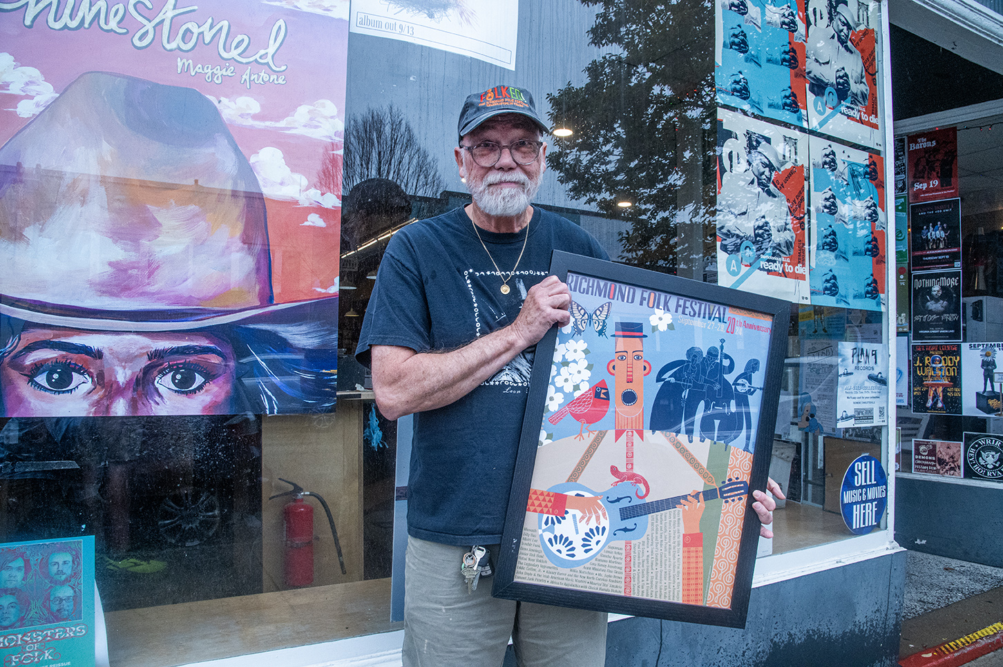 2. Meeting illustrator Robert Meganck in person at the Richmond Folk Festival merch tent after interviewing him about designing the festival’s poster 20 years after he designed one for the event’s inaugural year. The screen-printed version of this year’s poster now hangs opposite my front door, and its design hangs on my torso whenever I wear the supremely comfy, long-sleeve T-shirt I bought on a return trip to the merch tent.