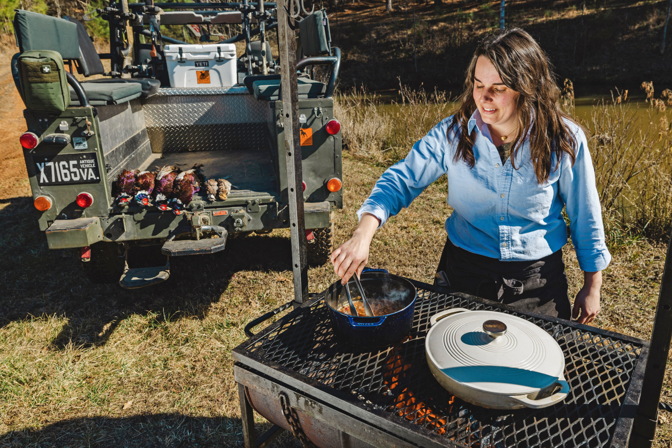 Her journey has led her to tend fires around the globe, from the ovens of Sub Rosa Bakery to remote campfires in South America and Mongolia reached via horseback. She found the fire to be a universal place of community — a common language spoken through food. Inspired by that connection, she launched Two Fire Table, a traveling open-fire project anchored by two custom, barrel-bottom grills.