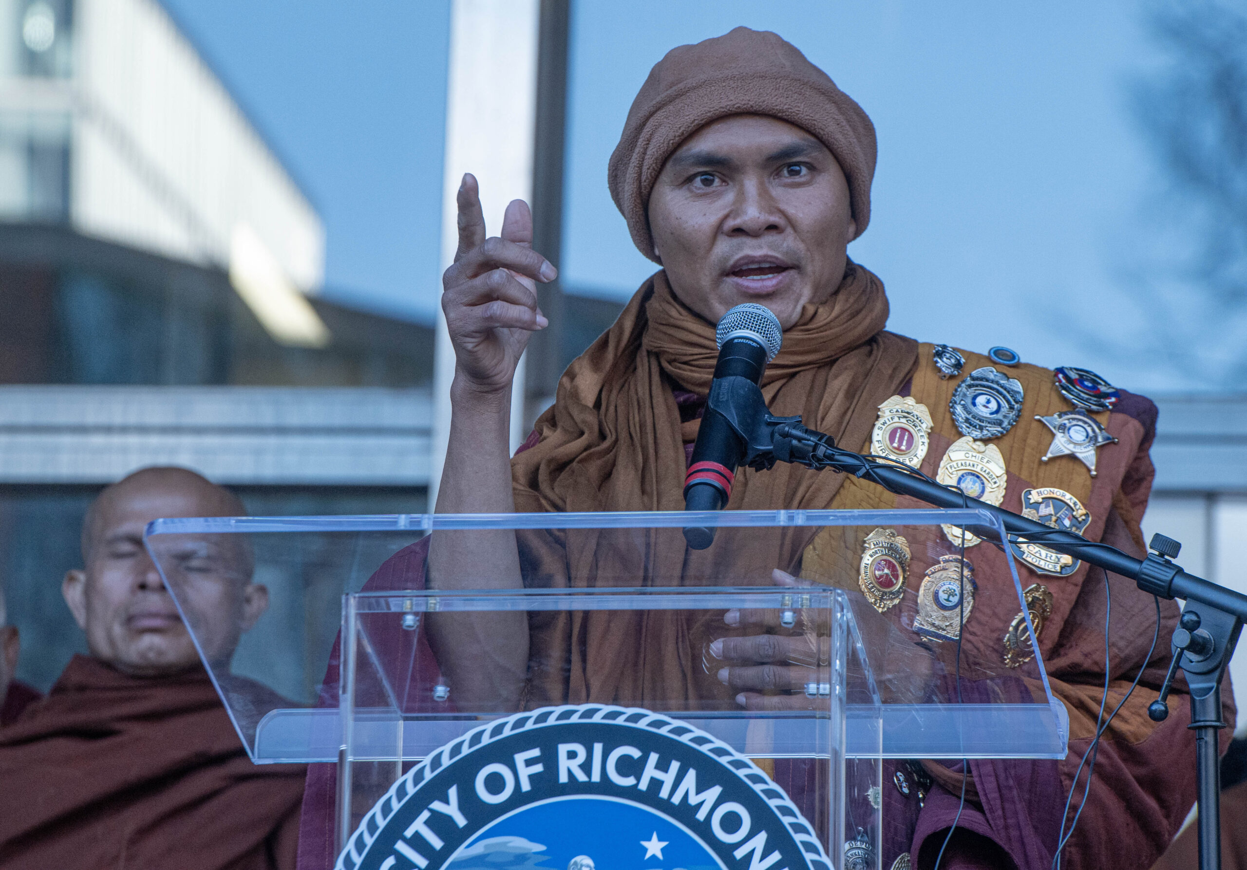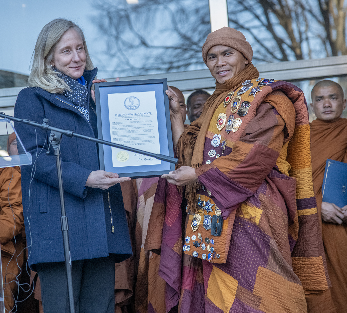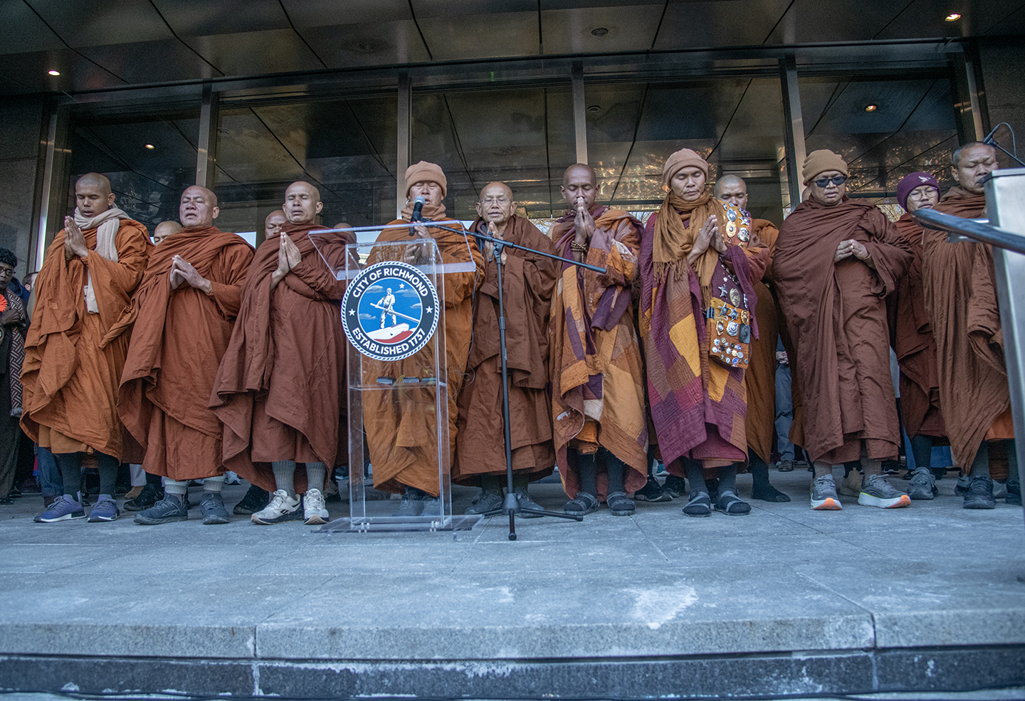 While the monks usually ask that people not walk along with them, they marked this epoch in their journey by inviting all visitors to accompany them from the fire station to City Hall, where Richmond Mayor Danny Avula and Virginia’s new Governor Abigail Spanberger waited to greet them and to issue a proclamation in their honor, standing alongside many other elected officials and police officers.