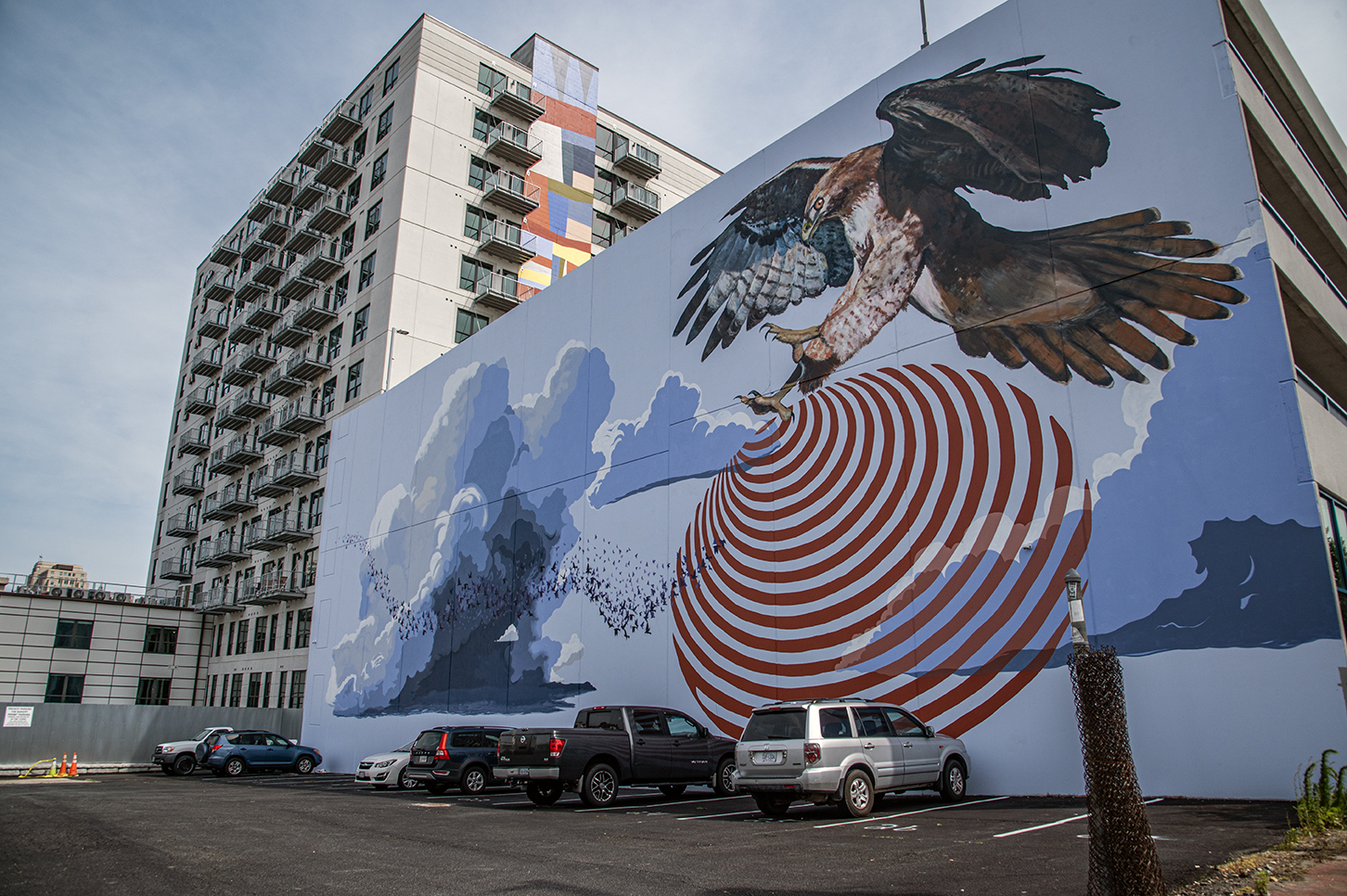 Richmond’s thriving art scene is also celebrated with a large mural, arguably one of the biggest in the city. Easily seen from I-95 by Main Street Station, the artwork was created by locally renowned muralists Ed Trask and Matt Lively and depicts a majestic red-tailed hawk and purple martins gliding through the sky.