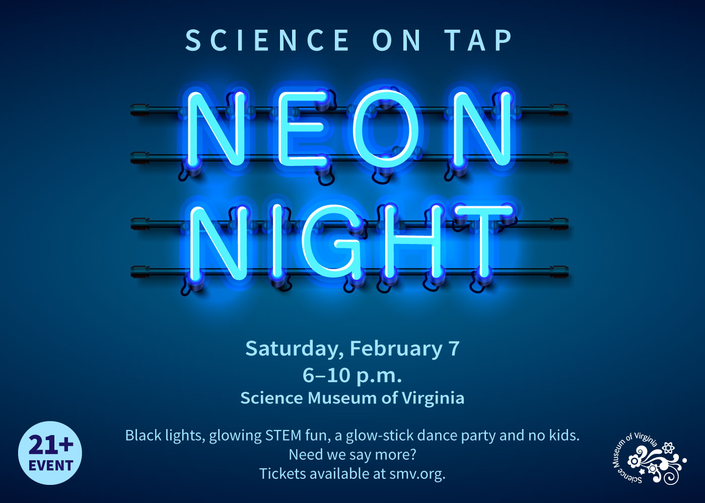 Science Museum of Virginia 2500 W Broad St, Richmond, VA, United StatesScience on Tap is back for 2026 with a 21+ event that will be a highlight of your weekend! What's Happening The Science Museum will have hands-on activities and demos inspired by light, neon and lasers. The entire Dewey Gottwald Center will be black lit and filled with glow-in-the-dark STEM fun from arcade games and […]