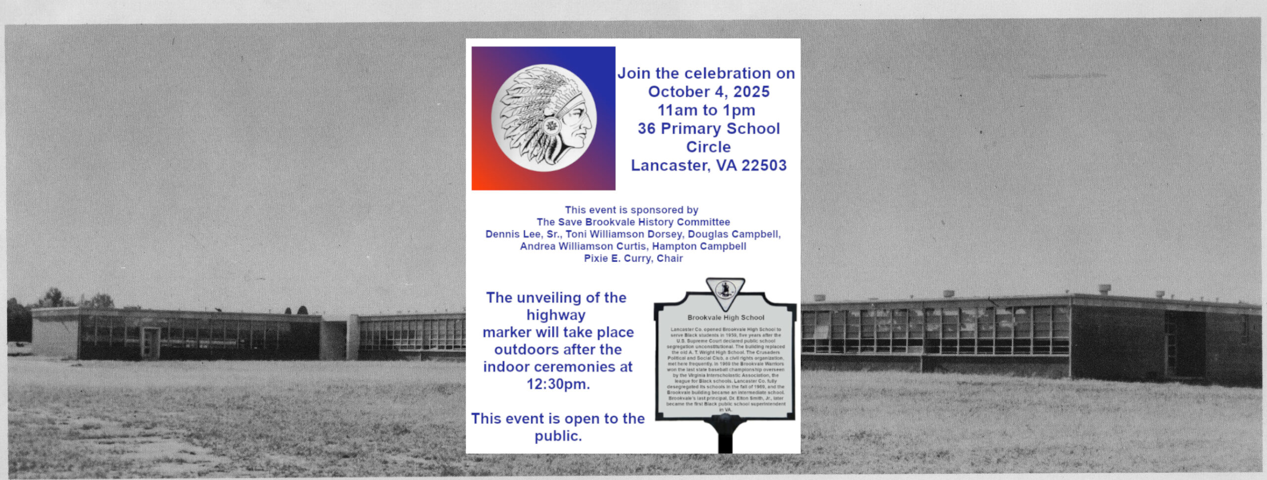 The former Brookvale High School 36 Primary School Circle, Kilmarnock, VA, United StatesThe dedication and unveiling of the Brookvale High School historical highway marker will take place on Oct. 4, 2025 at 36 Primary School Circle Lancaster, VA 22503. The doors open at 10 am, the program starts at 11am with the unveiling at 12:30pm. The event is open to the public. For more information, email savebrookvalehistory@gmail.com